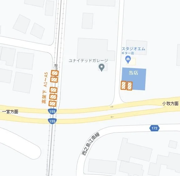 2)店の西側、線路の高架下「A1~A5」の5台の駐車場をご利用いただけます。