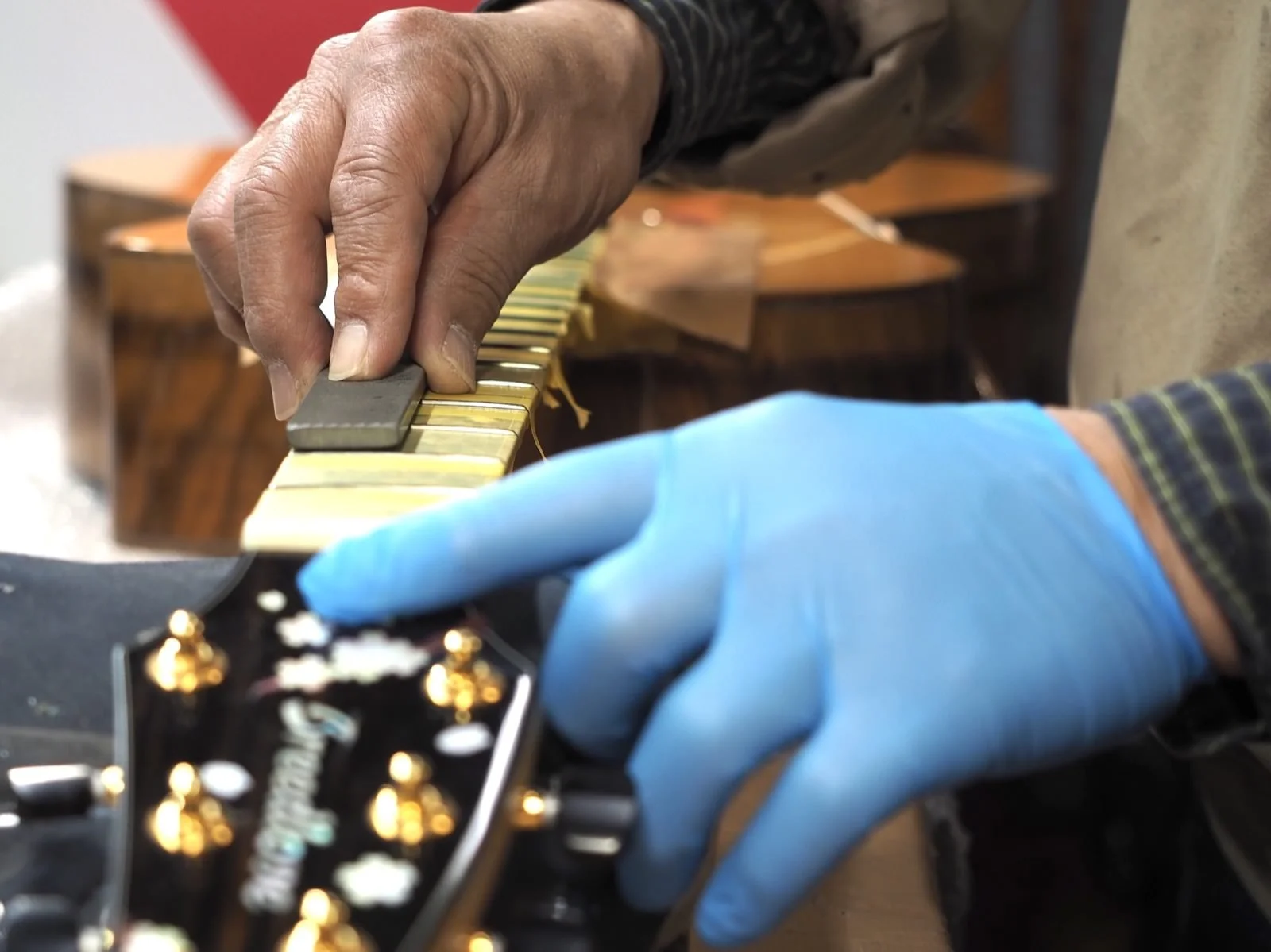弦高を低めにしても音詰まりが出ないように、フレットを擦り合わせて整えておきます。
