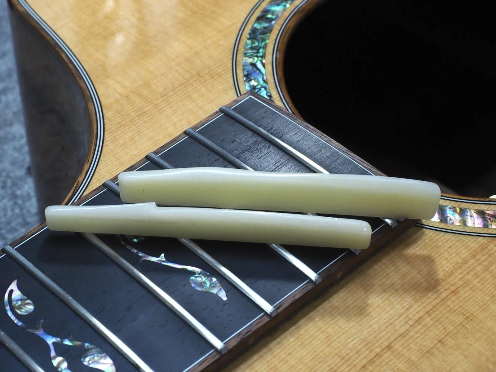 今回の弦高は、6弦2.3mm 1弦1.8mmが目標です。12フレット上でプラス1mm欲しいので、サドルは約2mm高くします。牛骨で磨き上げて製作しました。