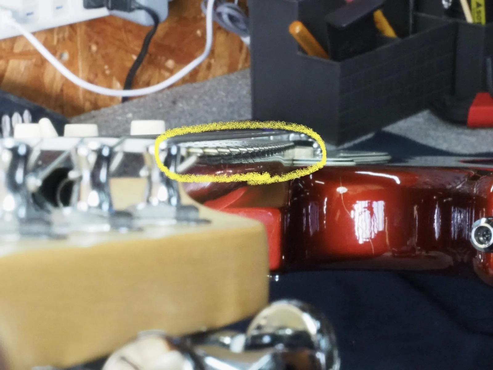 手前にヘッド、奥にボディというアングルでネックを見ています。黄色の丸で囲った、フレットの端の並びを見ると、ネックが順反りしている様子が分かると思います。