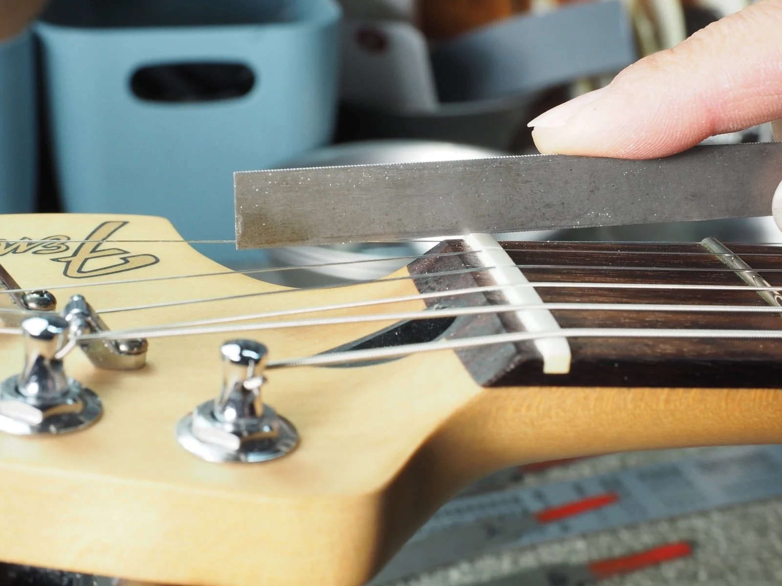 ナット溝も少し削って、ローポジションでの演奏性も改善します。