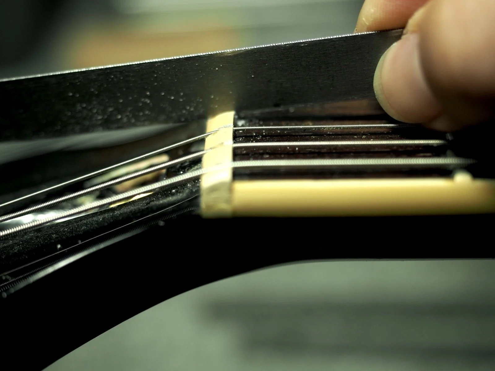 ナットの溝は交換するほどの消耗ではなかったので、各弦の高さを揃えて均一な力加減で押弦できるようにしました。