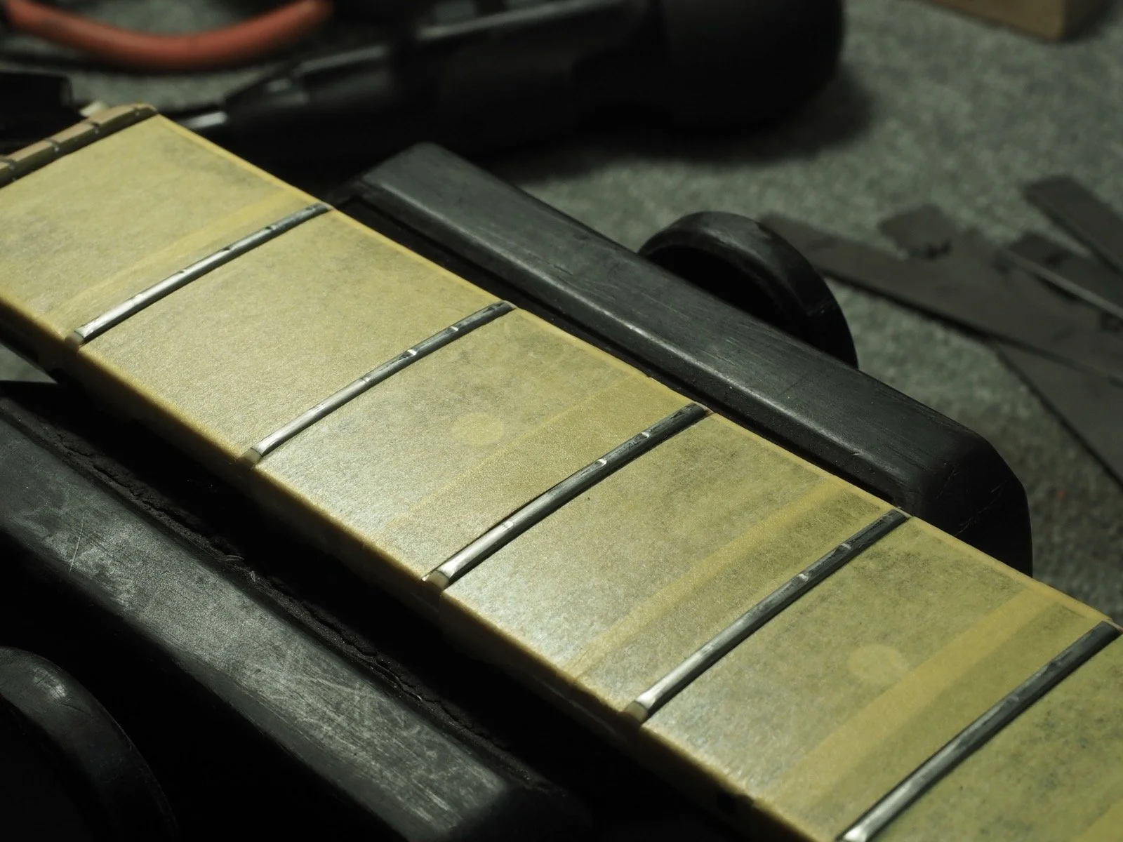 満遍なく擦り減りが見られるフレットです。弦高を下げるとフレットの高さのばらつきがビビリや音詰まりの原因になるので、擦り合わせて高さを揃えていきます。