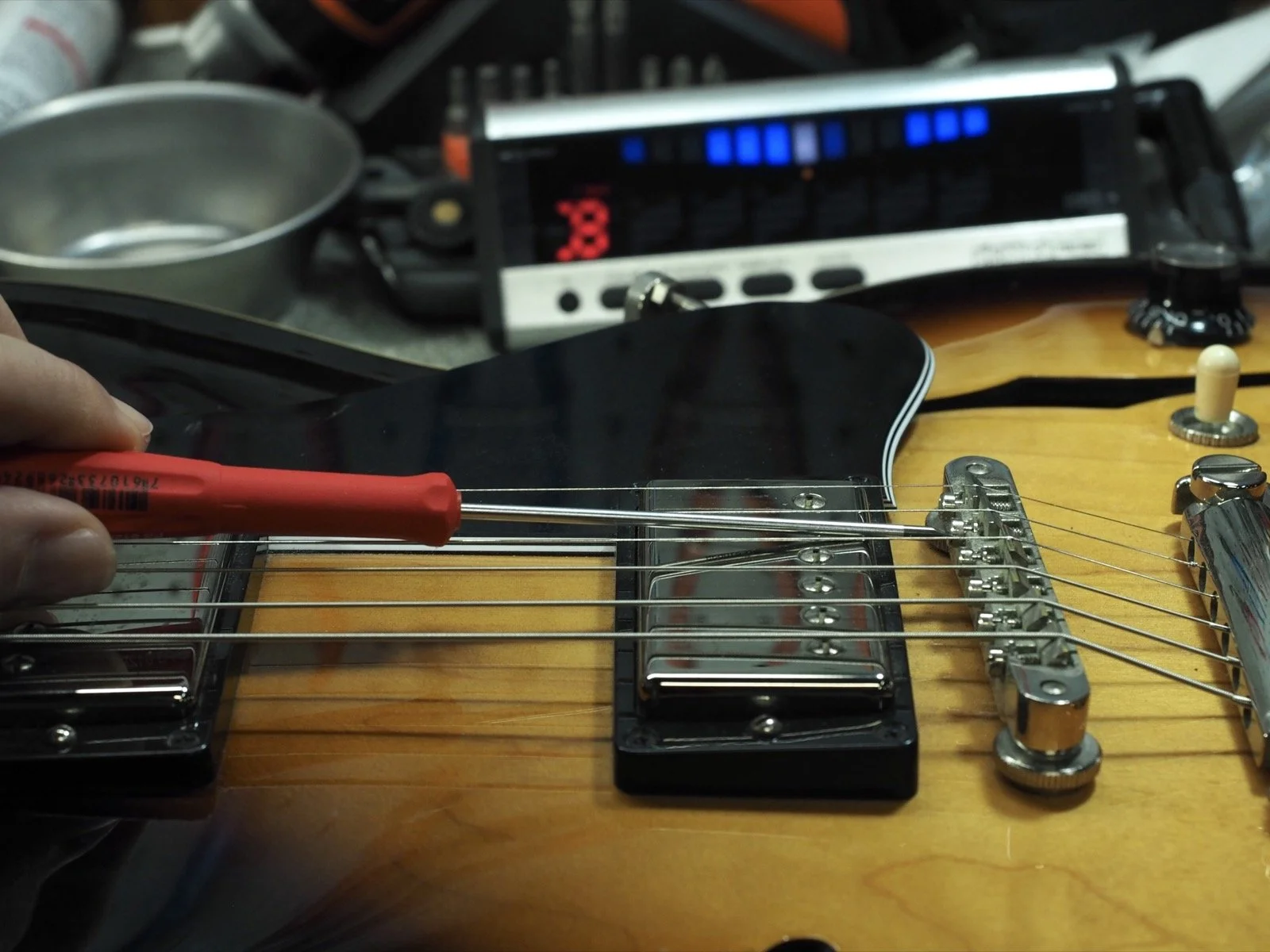 弦高を変更したので、サドルの前後を調整してオクターブピッチを合わせていきます。