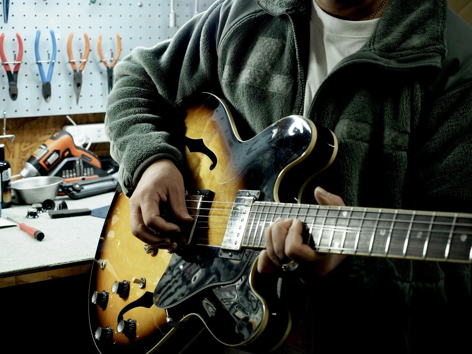 高校生の時にアルバイトしまくって新品で手に入れたギターをずっと弾き続けているとのこと。そんな胸熱エピソードを聞いたら、当然おじさんは応援モードに入っちゃいます。若者の手が伸びるとは考えにくい、かなり渋めなモデルだと思うのですが…、良いセンスしてますね。
