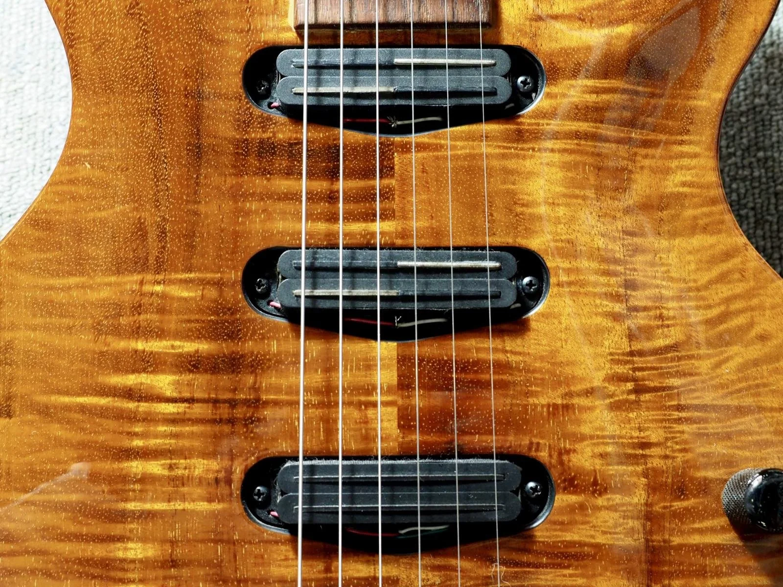 ピックアップはこのギターの特徴のひとつだと思います。一見すると3つのシングルコイルサイズのハムバッカーを搭載しているようですが、ネックとミドルポジションは、ハムキャンセル構造をもったシングルコイルのサウンドで、ブリッジピックアップだけがハムバッカーサウンドが得られるようになっています。