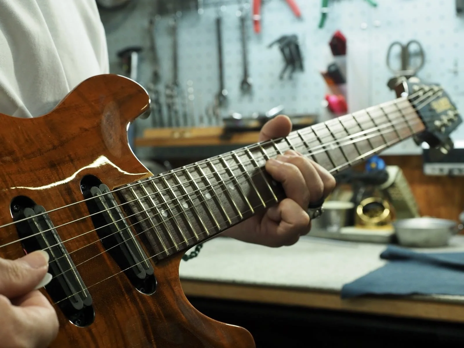 弦高を低くすると、細かなフレットの凹凸を拾ってビビリが出やすくなるので、予備的にフレットを擦り合わせます。