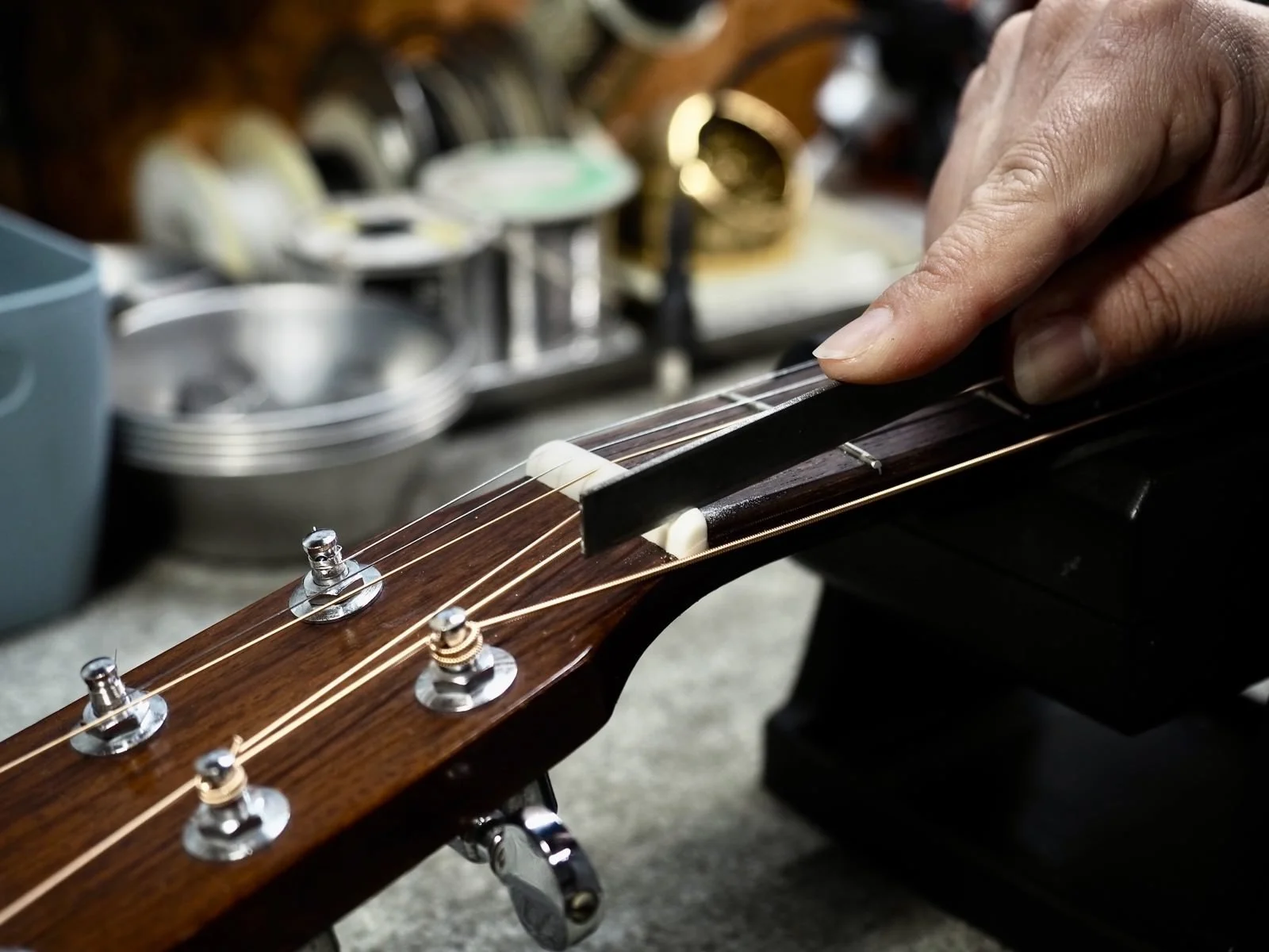ナット溝を削り、ローポジションでの押さえやすさを調整します。