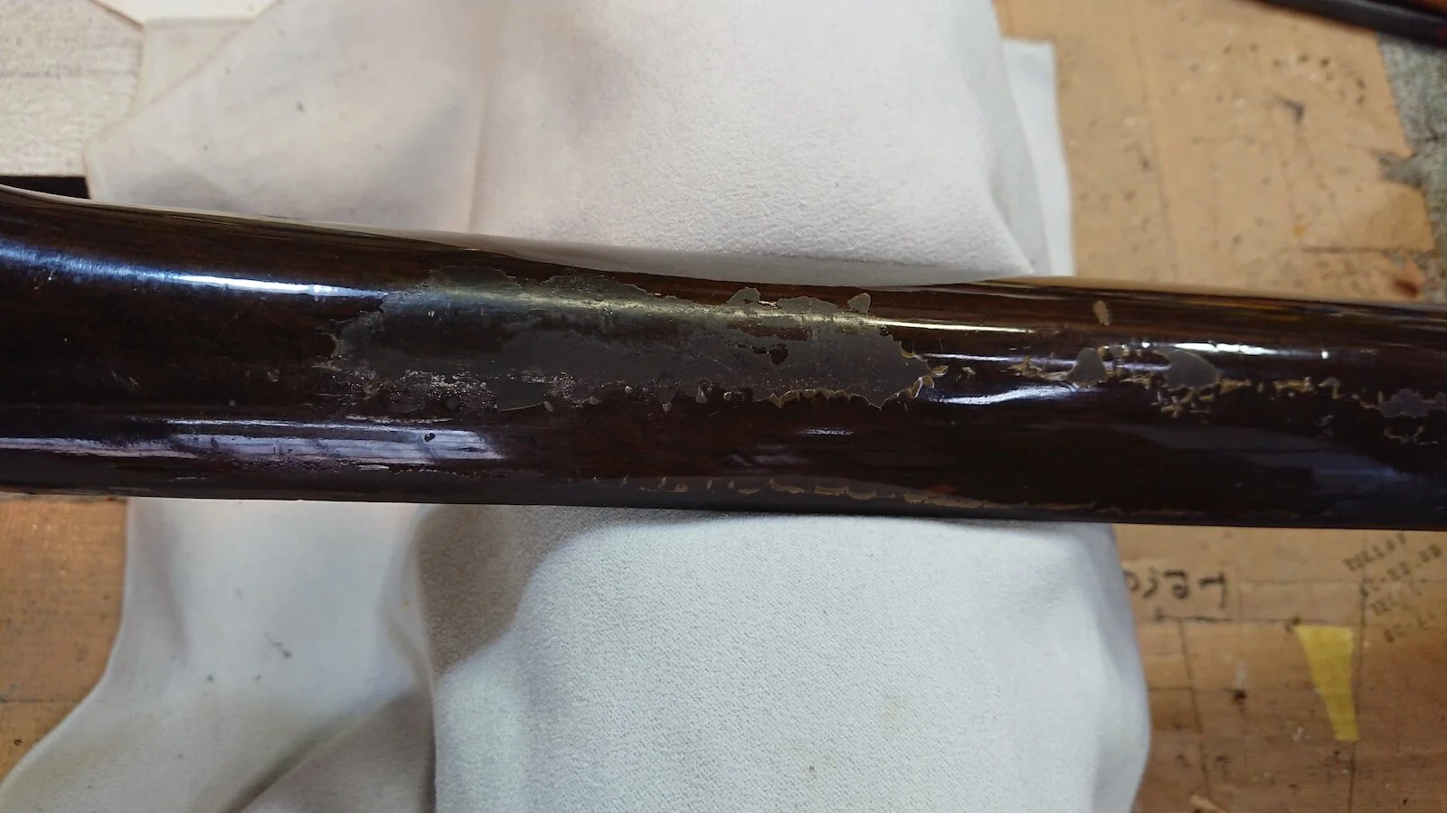 ラッカー系の塗装の場合は、経年劣化で変質してボロボロと消しゴムカスのように剥がれてきたり、ギタースタンドなどに使用されているゴムや化学繊維に触れて溶けてしまうことがあります。