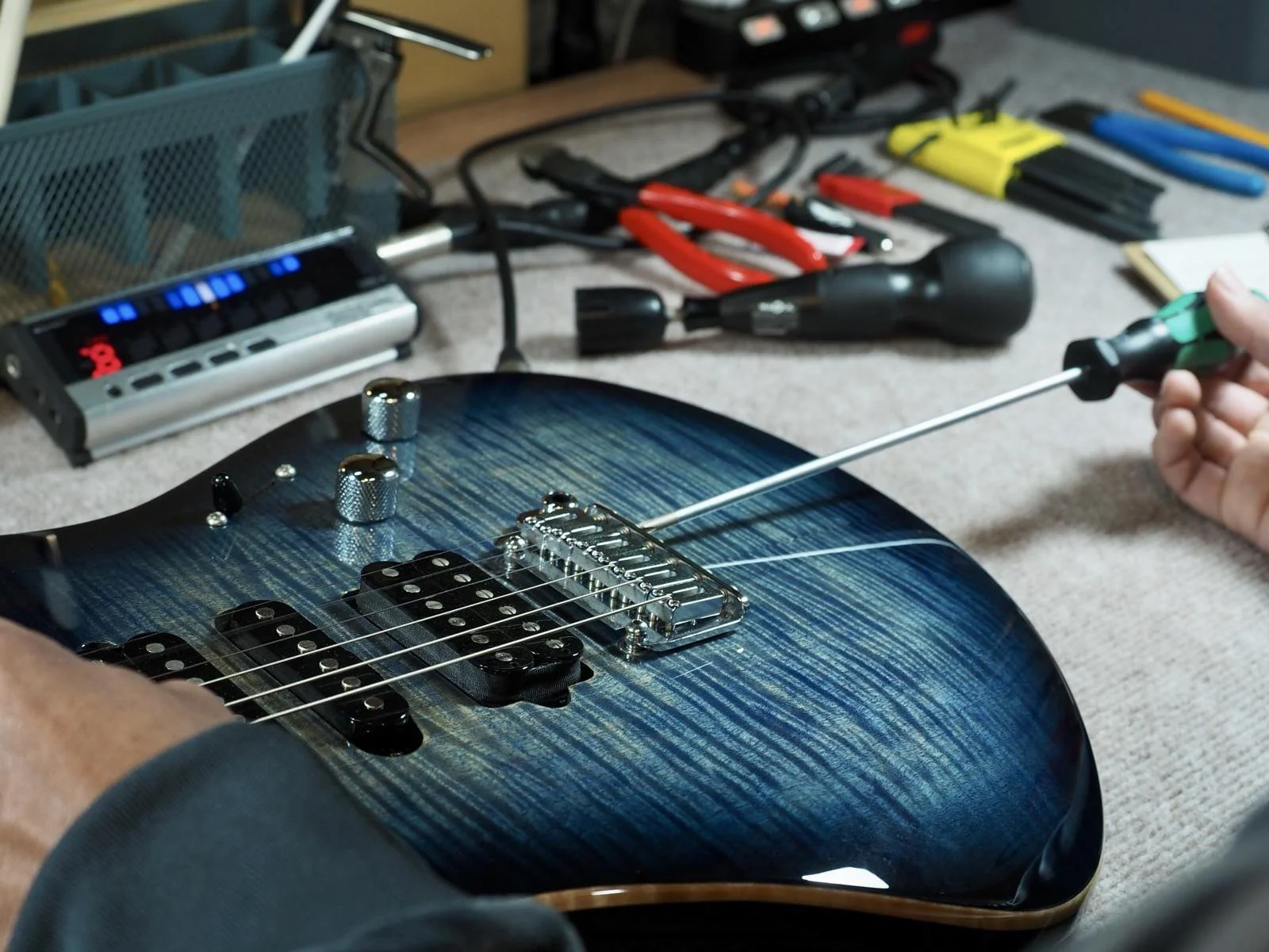 指板のラジアスに合わせながら、適切な弦高になるようにブリッジサドルの高さを調整します。トレモロユニットはGOTOH(日本製)なので、六角レンチは1.5mmです。