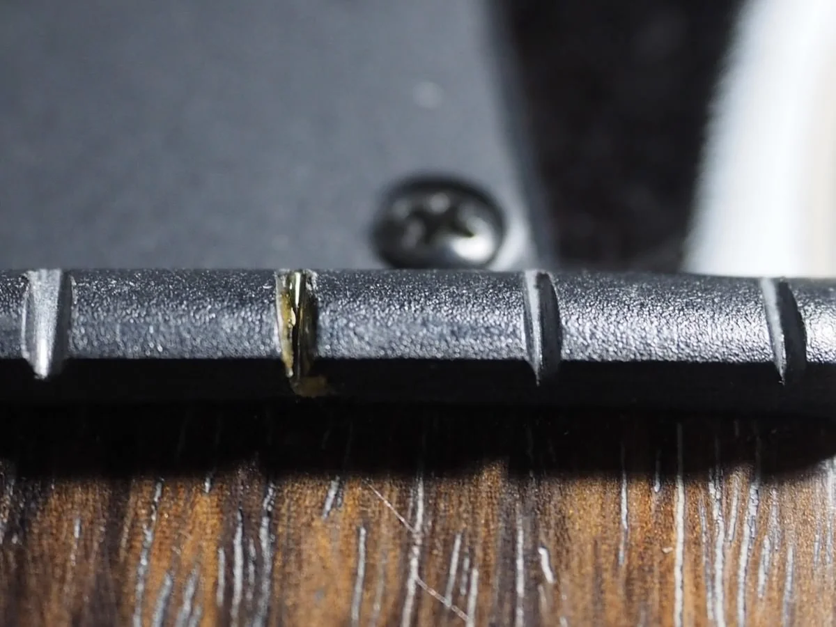 6弦と3弦の溝を拡大して観察すると、おそらく溝を深く切り過ぎたのを接着剤のようなもので埋めた痕跡があります。しっかり硬化する前に弦を置いたのでしょう、6弦の巻き線の痕までしっかり付いてしまっています。当然これではチューニングが安定しません。