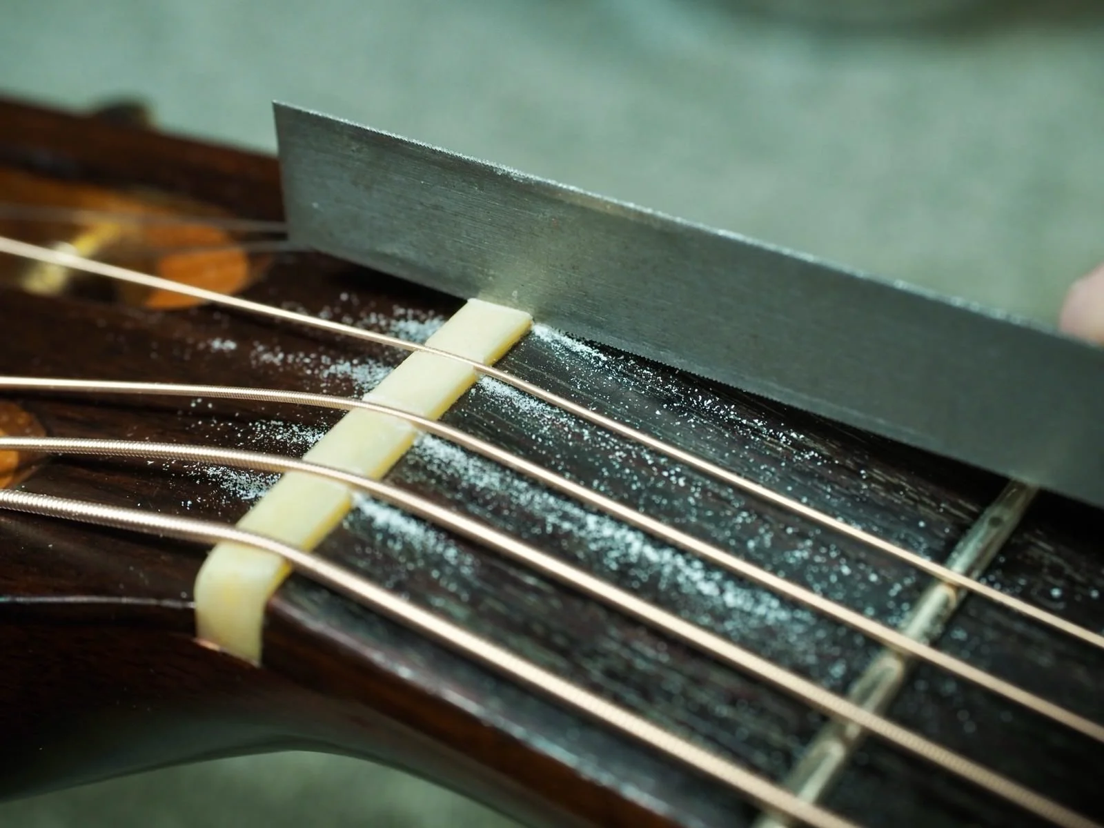 フレットの高さがわずかに不揃いだと、弦高を下げた時に音詰まりやビビリの原因になります。擦り合わせをすることで改善できます。