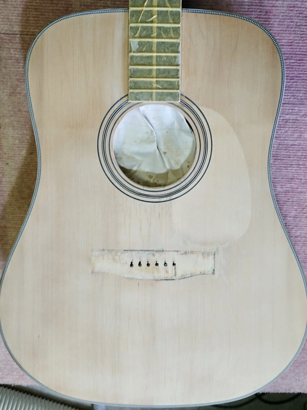 ブリッジを元通りに接着し、ペグやピックガードを取り付けます。